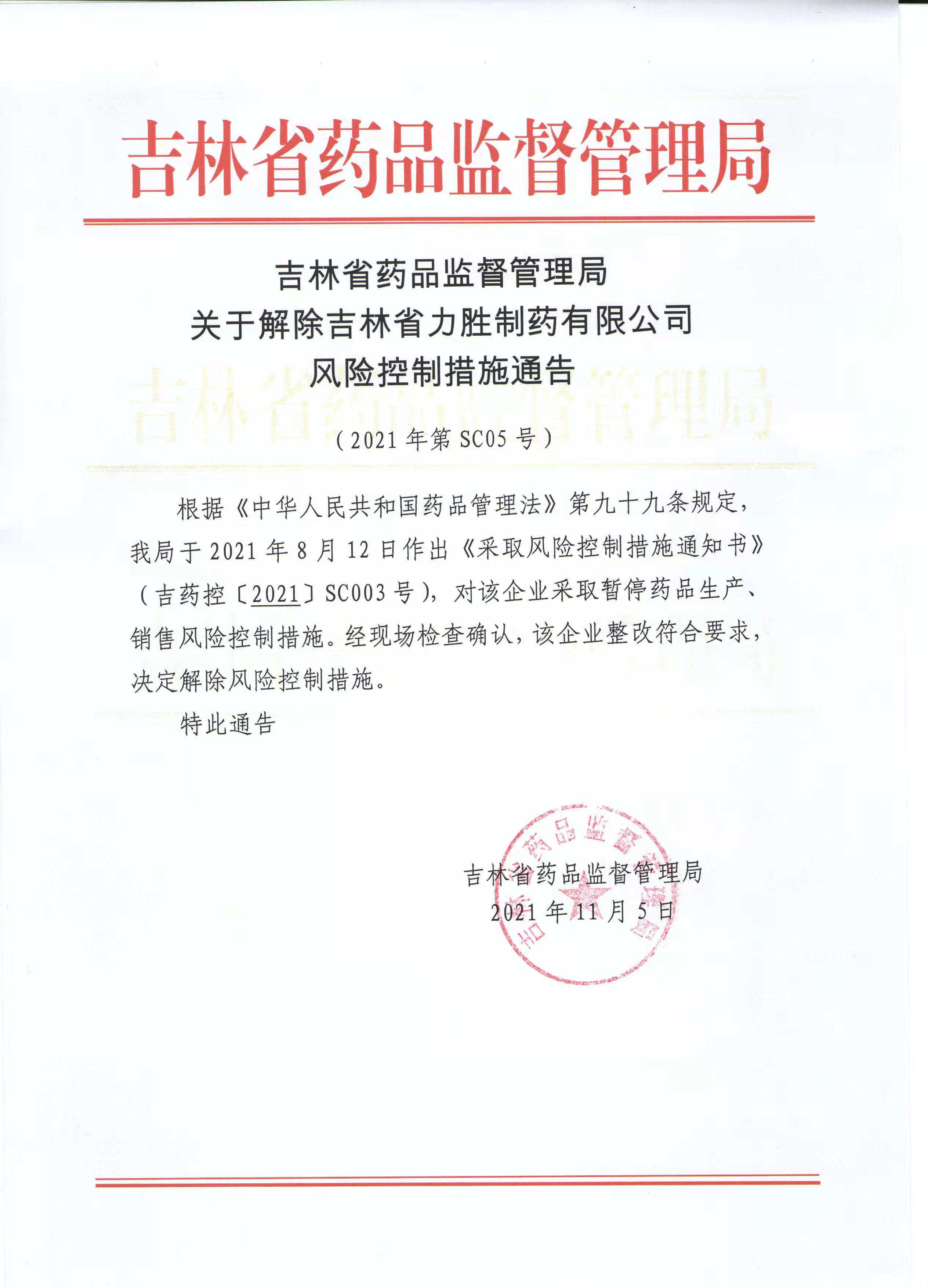 吉林省药品监督管理局关于解除吉林省力胜制药有限公司风险控制措施通告
