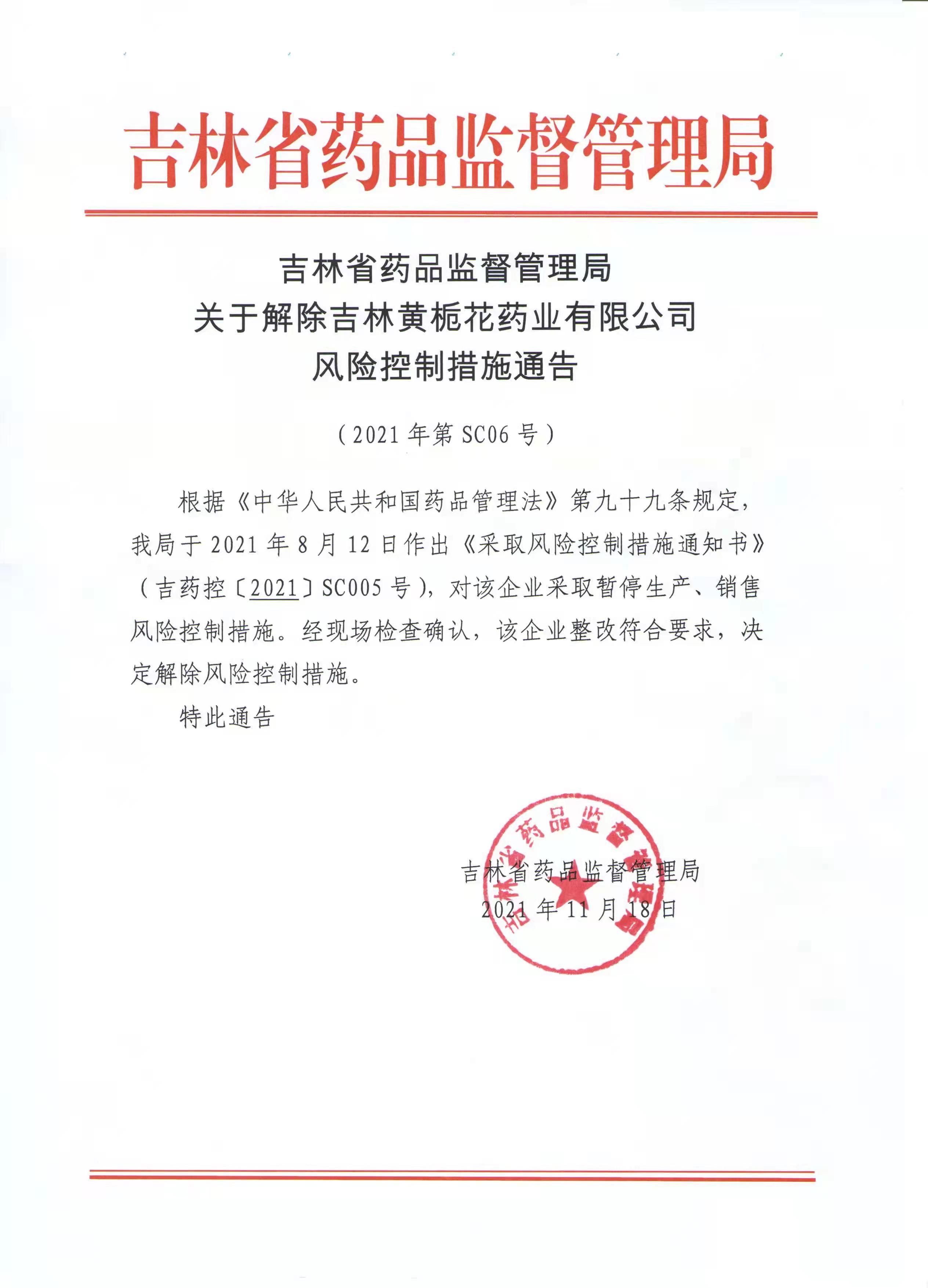 吉林省药品监督管理局关于解除吉林黄栀花药业有限公司风险控制措施通告