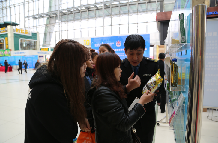 工作人员为咨询群众传授通过标签和外包装鉴别真假食品的技巧。